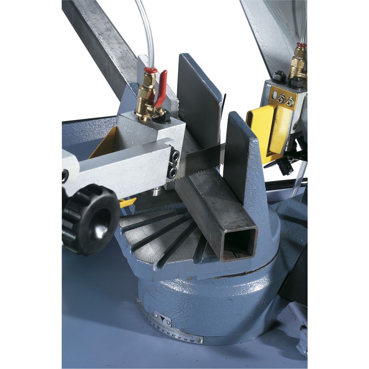 Sierra de cinta Bernardo, precisa y robusta, equipada con un potente motor y arco con giro de hasta 60°. Para cortar perfiles, tubos y materiales sólidos (acero y metales no ferrosos).