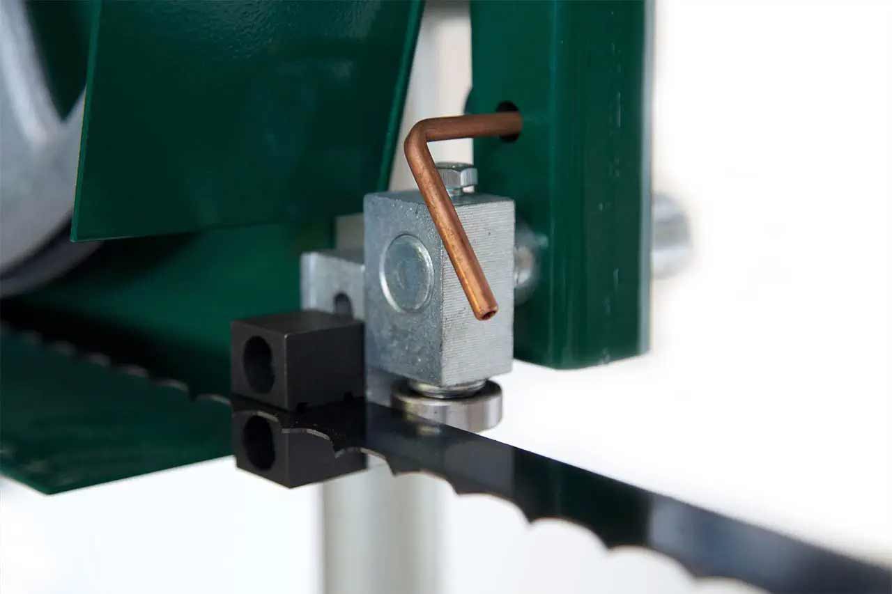 La guía de cuchilla ajustable con autobloqueo también permite reducir la oscilación de la cuchilla. Fabricada con rodillos en V de acero inoxidable y un brazo de aluminio mecanizado a juego, este sistema es superior a las guías de cuchilla ajustables tradicionales.